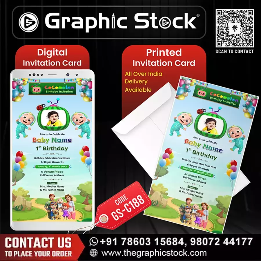 To invite your loved ones to this delightful celebration, a fun and vibrant invitation card (निमंत्रण पत्र) is essential. Graphic Stock proudly presents its adorable CoComelon Birthday Invitation Card (कोकोमेलन जन्मदिन निमंत्रण कार्ड), our design GS-C188. This CoComelon Invitation Card (कोकोमेलन निमंत्रण कार्ड) is meticulously crafted to capture the essence of the show, bringing JJ, his family, and all the friends to your party.