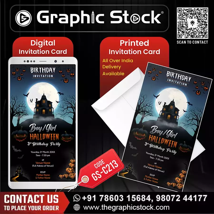 Whether you need a Customized Halloween Invite (व्यक्तिगत हैलोवीन कार्ड) or a Scary House Invitation, our team ensures perfection. We provide high-quality Digital Birthday Cards (HD डिजिटल कार्ड) and premium Printed Invites (प्रीमियम मुद्रित निमंत्रण) that reflect your joy. Order your GS-C213 Halloween Birthday Invitation Card today and let the spooky fun begin!