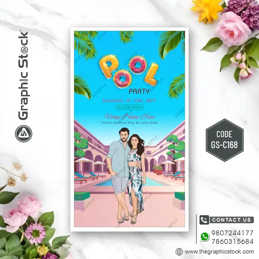 Celebrate every moment of your wedding with our multi-event invitation card featuring personalized caricatures of the bride and groom. Customizable for digital and printable formats, designed to include multiple functions such as Engagement, Mehndi, Sangeet, Pool Party, Reception, and more. Perfect for WhatsApp, Instagram, and physical invitations.