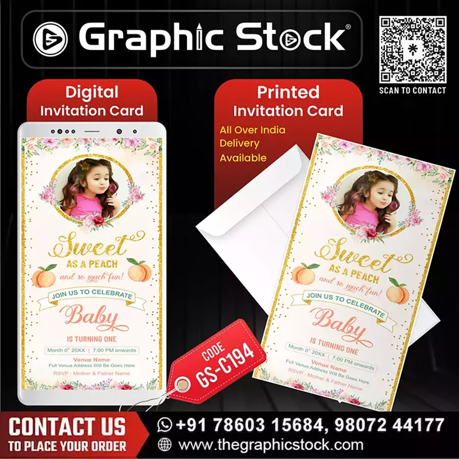 A baby’s first birthday is a truly magical milestone, a celebration of a year filled with firsts, joy, and unconditional love. It’s a moment to gather with family and friends to cherish the precious memories and look forward to the wonderful years ahead. To set the perfect tone for this heartwarming celebration, a charming and elegant invitation is a must. Graphic Stock proudly presents its adorable Peach Baby Birthday Invitation (पीच बेबी बर्थडे निमंत्रण). Our design, GS-C194, is a beautifully crafted card that captures the sweetness and innocence of this special day. This Peach Baby Birthday Invitation Card (पीच बेबी बर्थडे निमंत्रण कार्ड) is the perfect way to invite your loved ones to celebrate your little one.