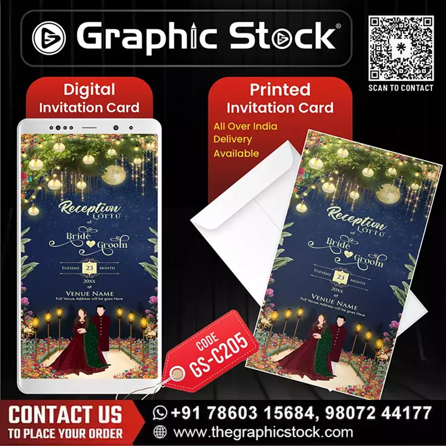 Graphic Stock is delighted to present its exquisite Elegant Wedding Reception Night Theme Invitation (सुंदर वेडिंग रिसेप्शन नाइट थीम इनविटेशन). Our design, GS-C205, is meticulously crafted to capture the enchanting essence of this celebration. This Wedding Reception Invitation Card (वेडिंग रिसेप्शन निमंत्रण कार्ड) is not just a call to attend; it is a promise of a night filled with romance and elegance.
